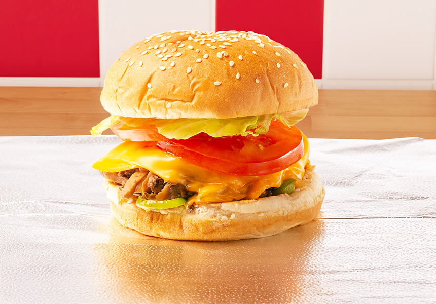 Freshly grilled onions, mushrooms and green peppers layered with lettuce, tomatoes and slices of American-style cheese on a soft, toasted sesame seed bun.